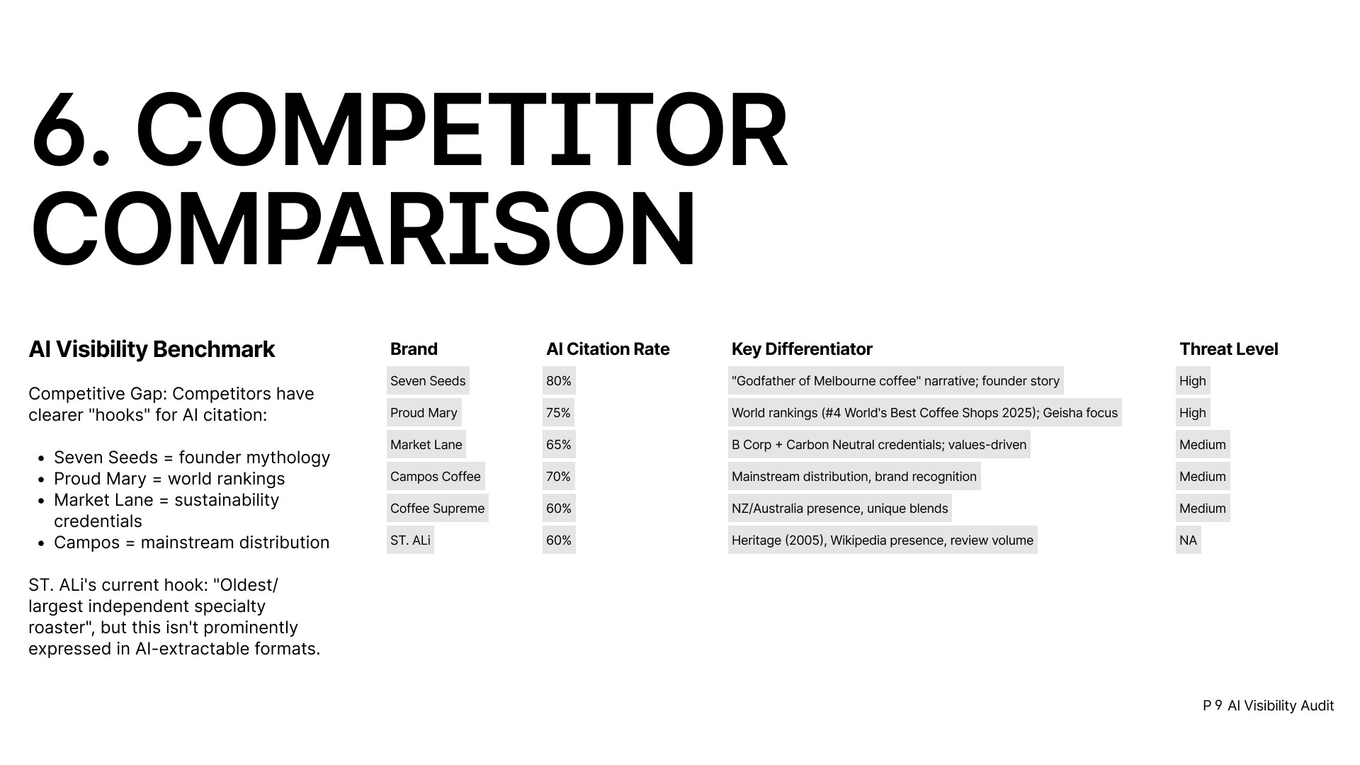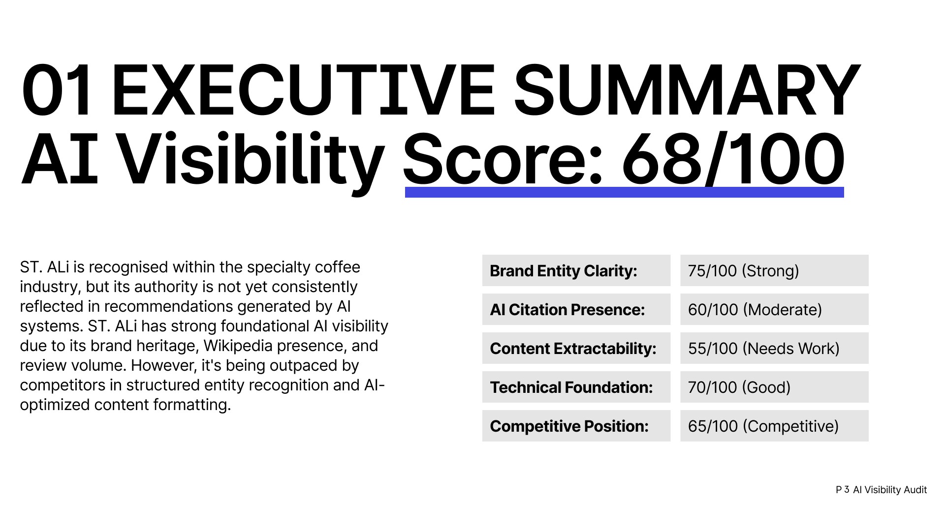 You’ll receive a ~12 page report analysing how AI systems recognise, mention and recommend your brand. It highlights where you appear, where competitors are recommended instead, and what to fix to improve your visibility.